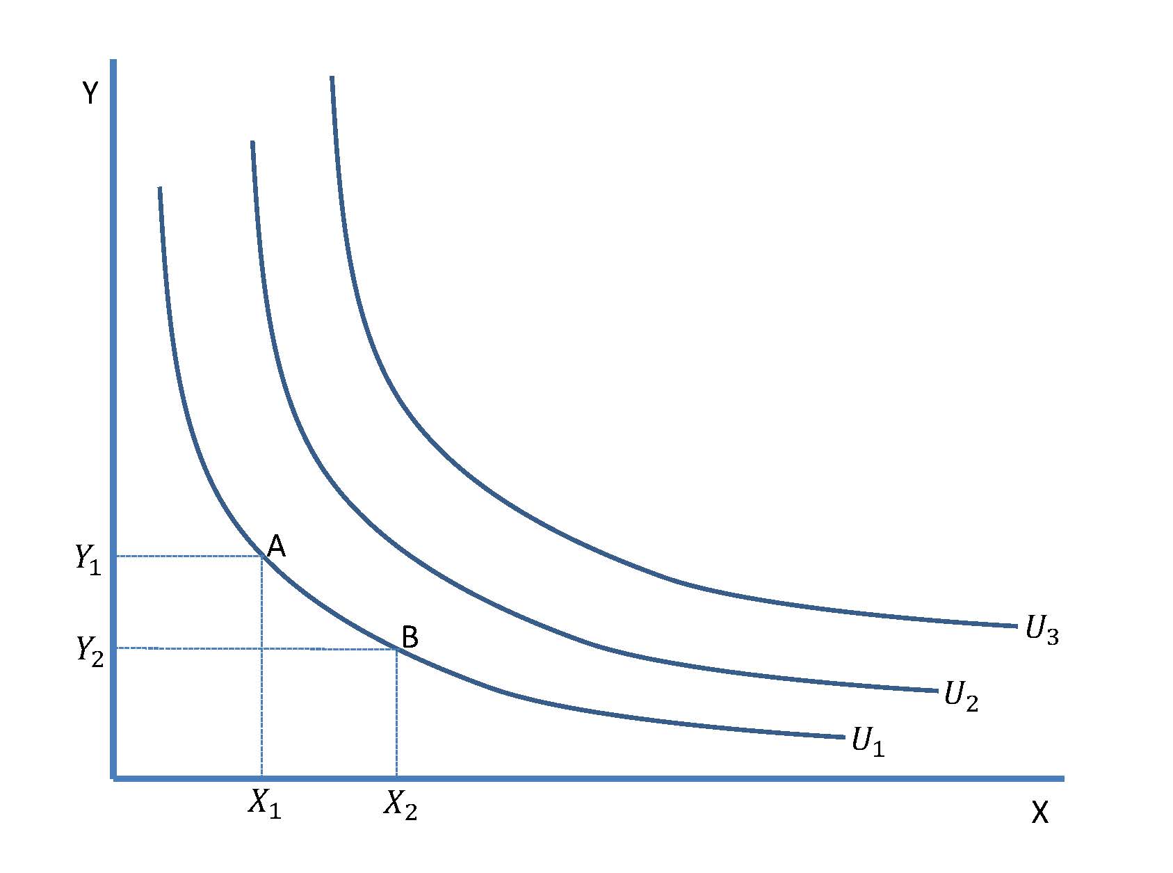 柯布-道格拉斯函数的无差异曲线,每条曲线上的效用都是相等的